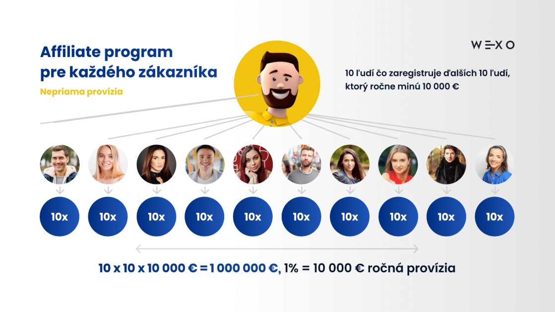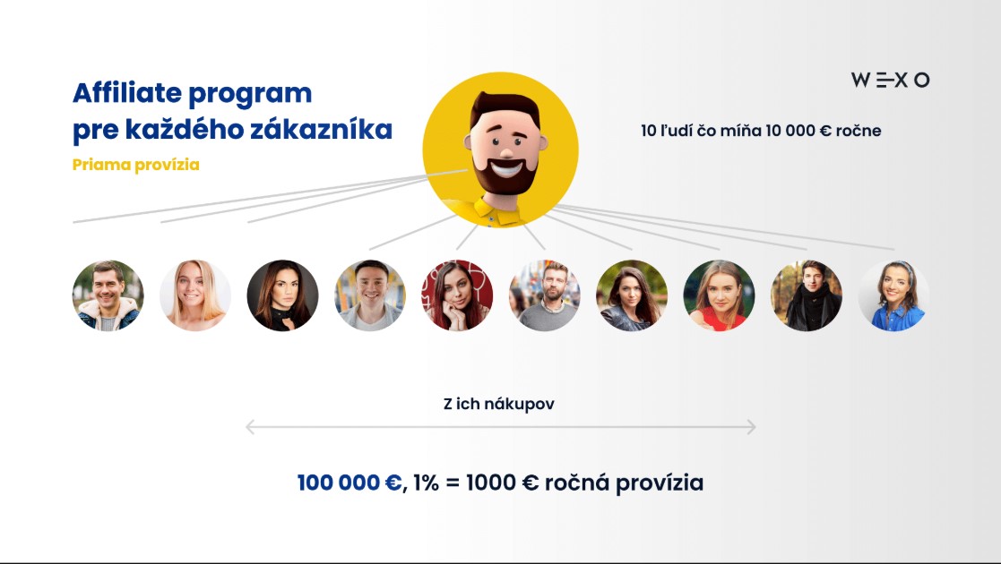 Napr. ste reštaurácia, zaregistrujete u vás pár ľudí, tí pôjdu potom napr. si kúpiť lieky alebo kvety k Wexo partnerovi, alebo pôjdu na obed k vašej konkurencii, tak aj z týchto nákupov vašich ľudí máte províziu 10% z ich cashbacku, Čiže aj pri nákupe vašich ľudí u iných Wexo partnerov.