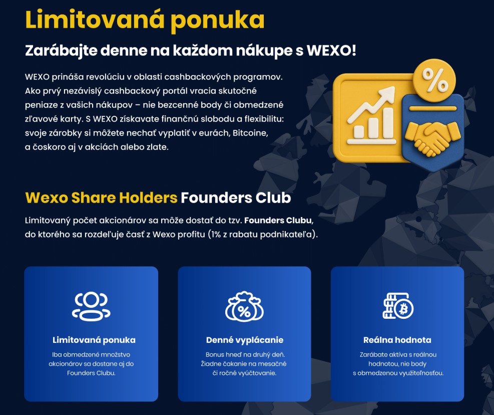 - ste v poole, ktorý akcionárom prerozdelí 5 % z 0,1 % Wexo denných tržieb a po prepočítaní sú tieto dividendy vyplácané každý deň.