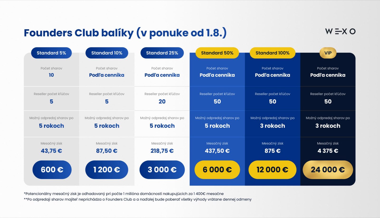6. Founders Club VIP 50 % - cena je 15 000 € a obsahuje adekvátne množstvo akcií podľa aktuálnej ceny, 1akcia/4,20€.